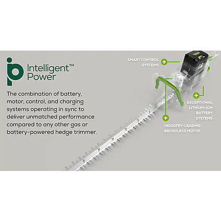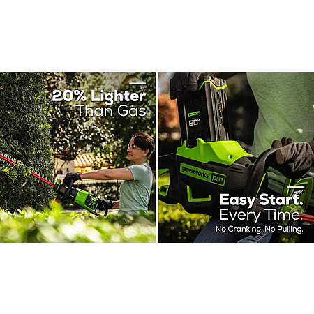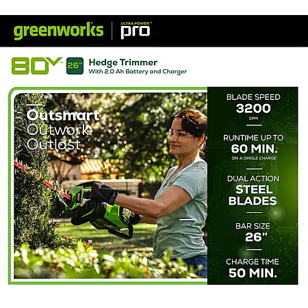 - Enjoy constant, fade-free power with no dangerous emissions, smells, hassles, or maintenance with the battery-powered Greenworks 80V 26" hedge trimmer. Limbs up to 1.1" are no match for this lightweight, quiet-running trimmer. It features dual-action, 26" laser-cut steel cutting blades and consistent cutting speeds up to 3,200 strokes per minute for fast, efficient cuts. The 180-degree rotating rear handle delivers precision cutting at any angle, and an over-molded, wrap-around front handle provides three-sided gripping for ultimate comfort and control. Greenworks unrivaled Intelligent Power combines TRUBRUSHLESS motor technology, lithium-ion battery power, and ultra-fast control systems for powerful output. Includes 2.0 Ah battery and rapid charger. Battery is compatible with 75+ Greenworks 80V products. Life. Powered. By Greenworks.