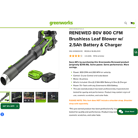 Save 40% by purchasing this Greenworks Renewed product (originally $249.99). Same power. Same performance. More savings.