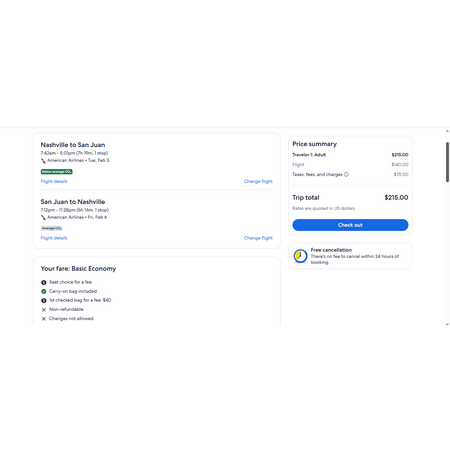 American Airlines, United Airlines, Southwest Airlines and Expedia have round trip airfares travelling to and from Nashville TN (BNA) and San Juan Puerto Rico (SJU) for $215, making 1 stop both ways. These are basic economy fares. On American and Southwest, you are allowed a personal item and a carry-on bag. On United, it's only a personal item. There is no seat selection and no change.