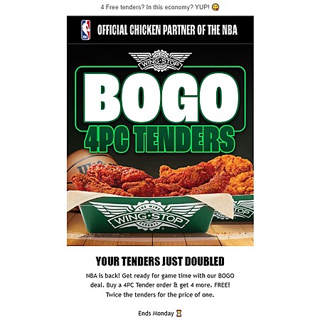 Valid only 10/21/2025 to 10/27/2025 at participating locations in the US on orders for carryout or delivery placed via Wingstop.com or the Wingstop App. Minimum purchase required. Two (2) 4PC Crispy Tenders (a la carte) must be in basket and the promo code in this email must be used to receive promotional item. Limited to one (1) 4PC Crispy Tenders (a la carte) per transaction. May not be combined with any other offers or promotions. Not available on third party marketplaces. Wingstop Restaurants Inc. reserves the right to cancel, suspend and/or modify any offer or promotion if any fraud, technical failures, human error, or any other factor impairs the integrity or proper performance of the offer, as determined by Wingstop Restaurants Inc. in its sole discretion. ©2025 WF LLC.