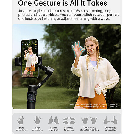 Trained on millions of scenes using a deep learning algorithm, the AI model uses the 2MP camera to deliver instant, accurate subject recognition and track people, animals, vehicles, and other objects without requiring external device pairing. Gesture commands can start and stop recording, activate tracking, and switch orientations. Subject framing can be fine-tuned manually using the joystick or remotely with a single tap.