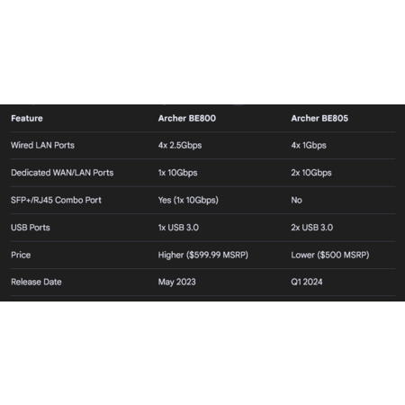 BE800 has 4x 2.5Gbps LAN, 1x 10Gbps WAN/LAN, 1x 10Gbps SFP+, 1x USB 3.0.