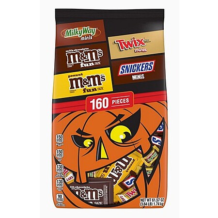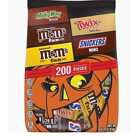 - There's a 200ct 77oz all-chocolate bag for the same price at some locations. It has M&Ms, Peanut M&Ms, Snickers, Twix, and Milky Way