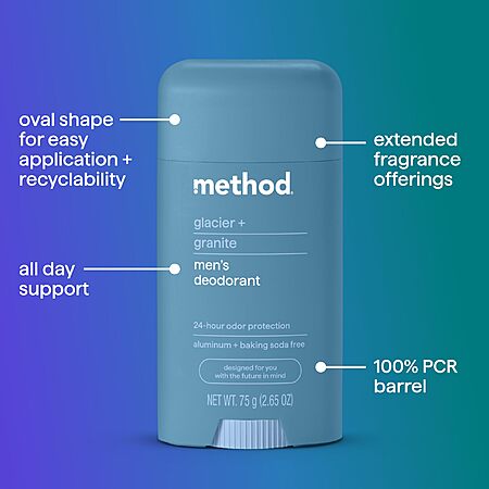 Method 2.65-Oz Men's Deodorant (Glacier + Granite or Cedar + Cypress) for $6.99 - $3 when you 'clip' the coupon on the product page - 5% when you check out via Subscribe & Save =