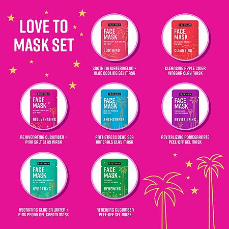 - Value Pack Freeman Love to Mask Set includes 12 Facial Masks, a headband, and a face buffer for all your skincare needs: 4 clay masks, 4 peel-off masks, 2 gel masks, 1 mud mask, and 1 face scrub