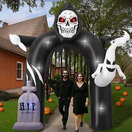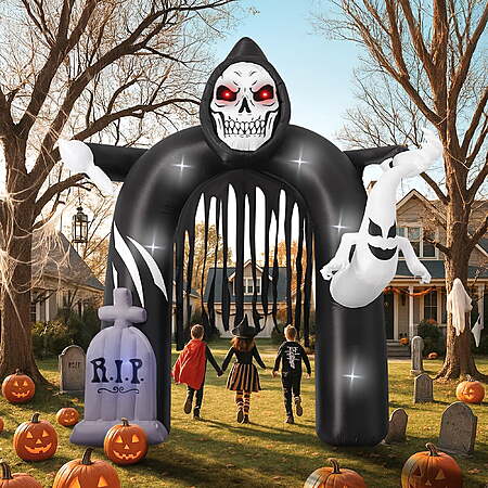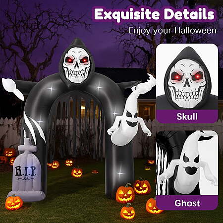Product Description: | Create a spooky and exciting Halloween display with the GVDV 10FT Inflatable Ghost Archway. This giant blow up decoration features a towering ghost with glowing LED eyes and eerie details, making it the perfect outdoor centerpiece for your yard, garden, or party entrance. Quick to set up with the built-in blower, it also comes with ground stakes, ropes, and water bags for stability. Made from durable, weather-resistant polyester, this Halloween inflatable archway is designed for long-lasting use. Ideal for welcoming trick-or-treaters, decorating your front yard, or adding atmosphere to Halloween parties. Large 10FT Design – Giant Halloween inflatable ghost archway creates a bold and spooky centerpiece for your yard or party entrance. Glowing LED Eyes – Bright built-in LED lights make the ghost arch shine at night and guide trick-or-treaters. Quick Inflation – Built-in powerful blower allows fast setup in just minutes, saving time and effort. Durable Weather-Resistant Fabric – Made of strong polyester with reinforced stitching, designed for long-lasting outdoor use. Stable Setup Accessories – Includes ground stakes, ropes, and water bags to keep the inflatable secure in windy conditions. Versatile Halloween Decor – Perfect for front yards, lawns, gardens, patios, or indoor party entrances. Easy Storage – Deflates quickly into a compact size for convenient off-season storage. Spooky Halloween Atmosphere – Unique ghost archway design instantly transforms your space into a fun Halloween attraction. |