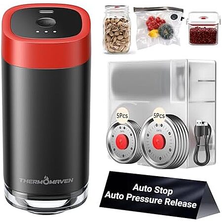 Model: ThermoMaven Patented Mason Jar Vacuum Sealer Kit, 4-in-1 Automatic Vacuum Sealer for Jar, Vacuum Bag, Container, Wine Stopper, Jar Sealer with 10 Auto Pressure Release & Reusable Lids, Black & Red