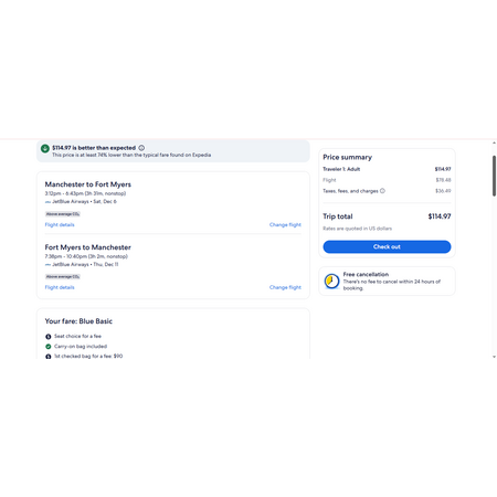 JetBlue and Expedia have round trip airfares travelling to and from Manchester NH (MHT) and Ft Myers FL (RSW) for $115 nonstop. These are basic economy fares, a restricted-type fare that allows a personal item and a carry-on bag. There is no seat selection and no change. If you are travelling with children, you will be seated together as per JetBlue's policy.