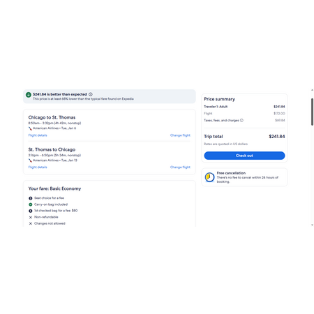 American Airlines and Expedia have round trip airfares travelling to and from Chicago (ORD) and St Thomas USVI (STT) for $247, making nonstop and 1 stop both ways. These are basic economy fares that allow a personal item and a carry-on bag. There is no seat selection and no change. If you are travelling with children, you will be seated together as per AA's policy.