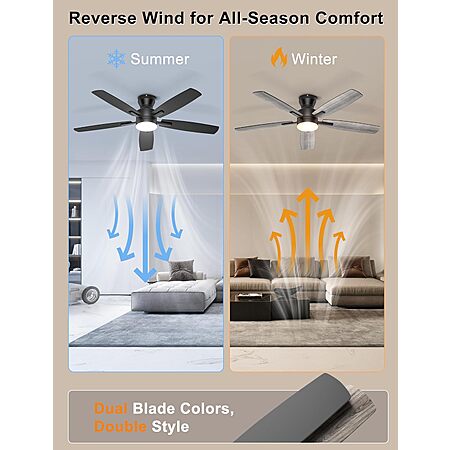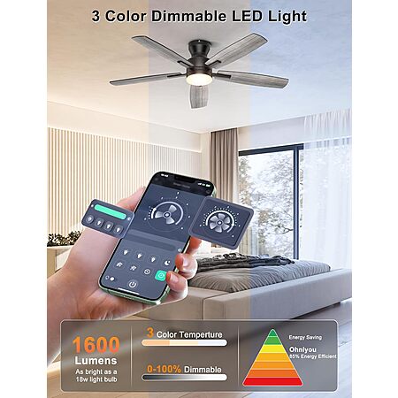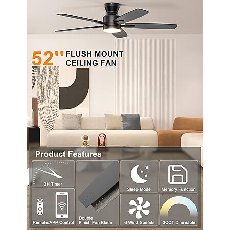 **Price Drop** Ohniyou 52" Low Profile Ceiling Fan w/ LED Light & App/Remote Control (Black) $50.04 + Free Shipping