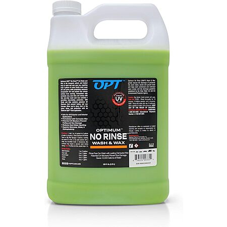 Wash and Wax Product Description:- The Premium Car Wash Soap Alternative: Optimum No Rinse Concentrate only requires 1 oz per 2 gallons of water - enough to wash your entire car! ONR can be used to clean and detail cars, motorcycles, boats, airplanes, RVs, and more. This all-in-one car detailing product allows you to wash and wax in one easy step.