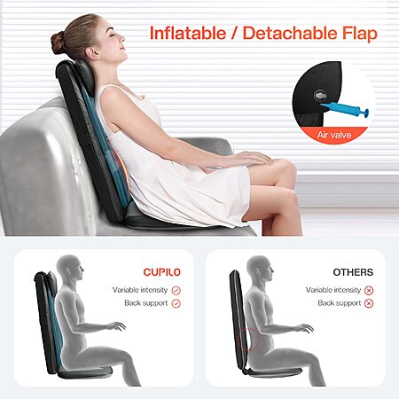 This back massager features inflatable flaps for adjustable intensity and spinal support, alongside a Shiatsu function that targets different back zones with deep, relaxing pressure.