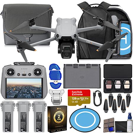 This Bundle Includes: DJI Air 3S Drone, RC 2 Remote Controller, 3 x Intelligent Flight Battery, 128GB Extreme microSD Memory Card, High USB Speed Memory Card Reader, Shoulder Bag , Drone Photography Backpack, 3 x Extra Pair of Low-Noise Propeller, Gimbal Protector, USB-C PD Cable, ND Filter Set (ND8, ND32 & ND128), Battery Charging Hub, Drone Landing Pad, Camera Lens Cleaning Kit, 6-Slot Memory Card Wallet, CPS 2 Year Warranty, Bundle It Better Lens Cloth