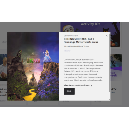 Offer begins 11/06/2025 and ends 11/14/2025. Offer limited to Diamond tier Xfinity Rewards members 18+ with account in good standing while supplies last. Comcast reserves the right to modify or cancel offer at any time. May not be assigned or transferred. All redemptions are final. Fandango Promotional Code ("Code") is good for up to $30 off the purchase of 2 movie tickets ($15 per ticket, up to $30 total ticket price and associated fees and charges) to see Wicked: For Good at participating Fandango theaters in the US.