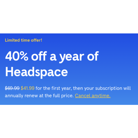 Headspace 1 year subscription - 40% off a year of Headspace - $41.99