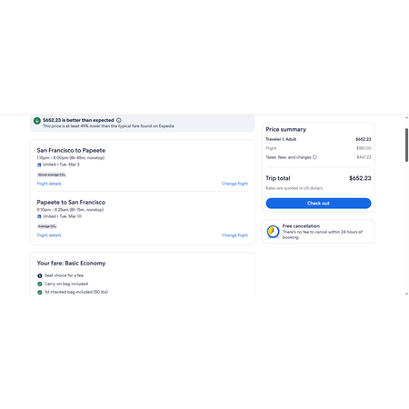 United Airlines and Expedia have round trip airfares travelling from San Francisco (SFO) to Tahiti, French Polynesia (PPT) for $653, nonstop. This is basic economy fare and allows a personal item, a carry-on bag and 1 free checked bag. There is no seat selection and no change. If you are travelling with children, you will be seated together as per UA's policy.