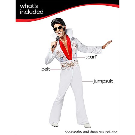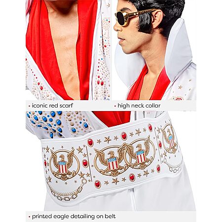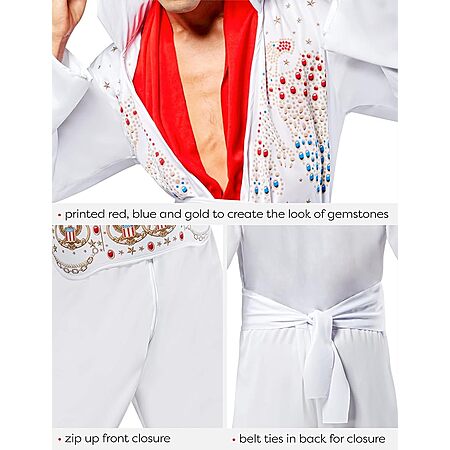 - OFFICIALLY LICENSED: Elvis Presley. THE RIGHT FIT: Men's size xl (44-46in jacket), when deciding size, please note costumes run smaller than apparel. Please refer to drop down size chart