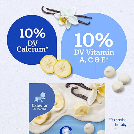 • Baby yogurt snacks contain live and active cultures and are a good source of vitamins A, C and E