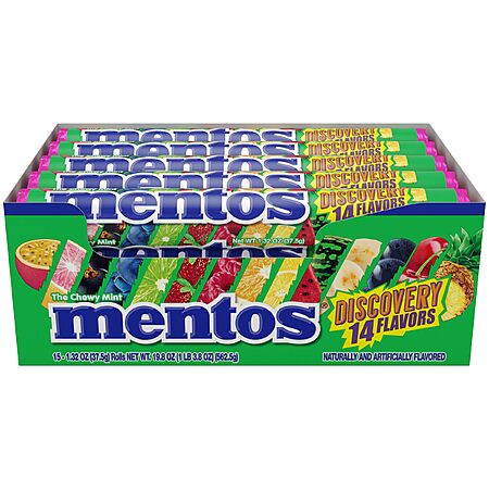 $13.67:[S&S]Mentos Chewy Mint Candy Roll, Discovery 14 Assorted Fruit Flavors, 14 Pieces Per Roll, 15 Count Showbox