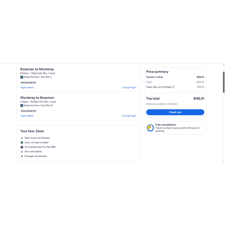 Alaska Airlines and Expedia have round trip airfares travelling to and from Bozeman MT (BZN) and Monterey CA (MRY) for $188 making 1 stop both ways. These are basic economy fares that allow a personal item and a carry-on bag. There is no seat selection and no change. If you are travelling with children, you will be seated together as per Alaska's policy.