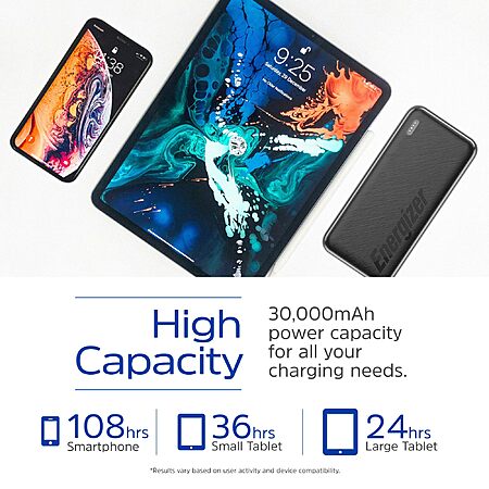 HIGH-CAPACITY 30,000MAH PORTABLE CHARGER - The Energizer UE30050C delivers reliable, extended power for your devices. This essential power bank provides up to 72 extra hours for most smartphones (iPhone, Android), 24 hours for small tablets, and 16 hours for larger tablets. It's the ultimate travel power bank and portable phone charger for seamless on-the-go connectivity and productivity.