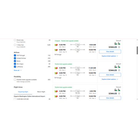 TAP Air Portugal via Booking.com have round trip airfares travelling from Washington DC (IAD) to Madrid Spain (MAD) for $345, making 1 stop in Lisbon Portugal both ways for several hours. These are economy light fares that will allow a personal item and a carry-on bag. Plus you will be served a meal during your flight.