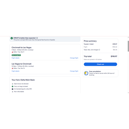 Delta Air Lines and Expedia have round trip airfares travelling to and from Cincinnati OH (CVG) for $199, nonstop. These are basic economy fares that allow a personal item and a carry-on bag. There is no seat selection and no change.