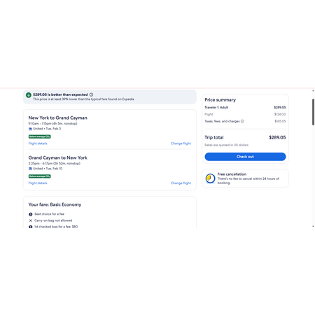 United Airlines and Expedia have round trip airfares travelling from New Jersey (EWR) to Grand Cayman (GCM) for $290, nonstop. These are basic economy that only allow a personal item. There is no seat selection, no carry-on bag and no change. If you are travelling with children, you will be seated together as per UA's policy.