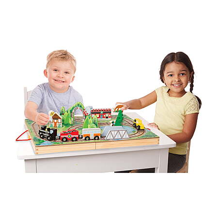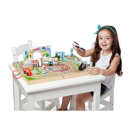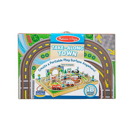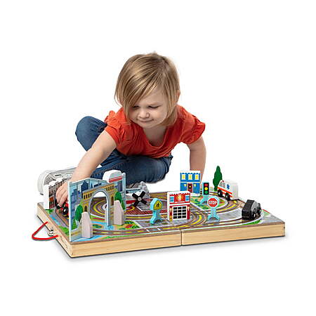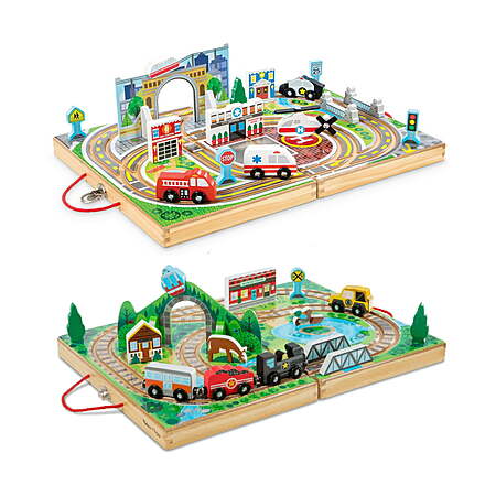 Built-in tracks, colorful scenery, and fun play pieces let kids take their imaginations for a spin... and take playtime anywhere they want to go! Unfold the sturdy wooden case to create an illustrated play surface with built-in road/train tracks for the three wooden wheeled vehicles/trains (a police car, ambulance, and fire engine) and a wooden helicopter to race to the rescue and a park ranger vehicle. Set up a bridge and a city/mountain tunnel with a monorail/gondola that slides across the top! Wooden play pieces include buildings, traffic signs, animals, railroad crossing sign, and a tree to enhance imaginative storytelling. All the pieces store in the fold-up case with convenient carrying handle for easy cleanup and travel (there's plenty of room to add other toys, too!). Keep playtime rolling for kids three and older and encourage independent play and motor skill development.