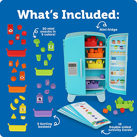 51-piece set includes 1 mini fridge (about 12 inches tall), 30 mini food items, 5 colored sorting baskets, 15 activity cards, and a detailed instruction booklet