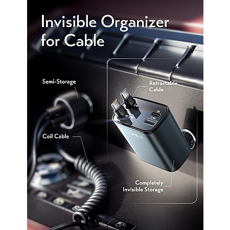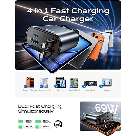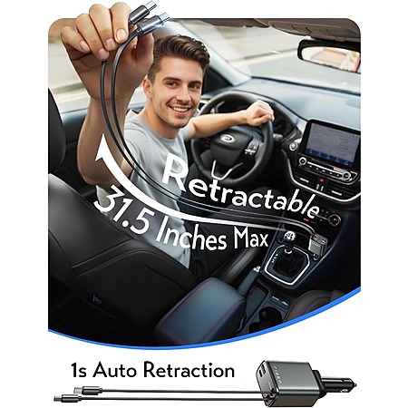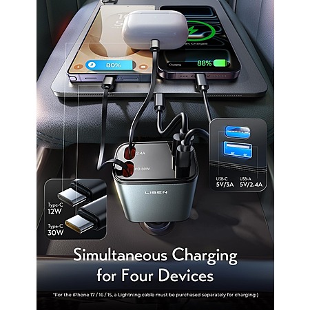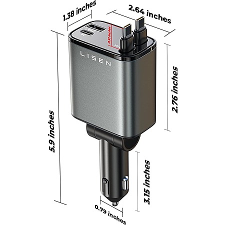 LISEN Retractable Car Charger, up to 69W w/ 3x USB-C, 1x USB-A $12.91 + Free Shipping w/ Prime or $35+ orders