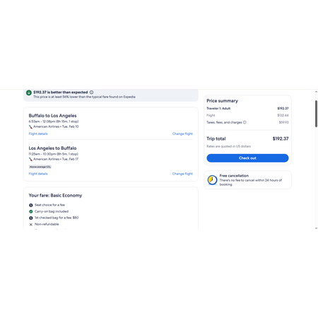 American Airlines, Southwest Airlines and Expedia have round trip airfares travelling to and from Buffalo NY (BUF) and Los Angeles (LAX) for $193, making 1 stop both ways. These are basic economy fares. On American and Southwest, you are allowed a personal item and a carry-on bag.