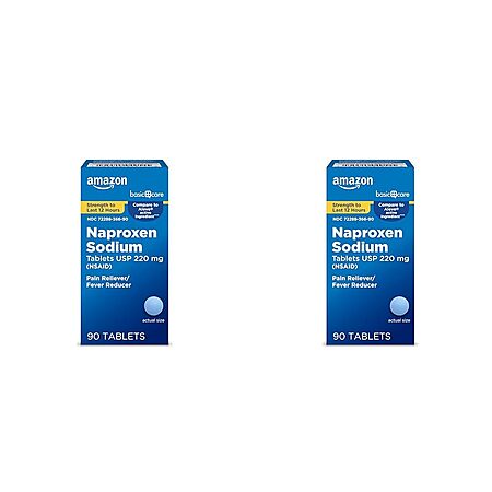$5.99 180 count Amazon Basic Care Naproxen Sodium Caplets 220 mg (2-pack 90 count) Fever Reducer and Pain Reliever