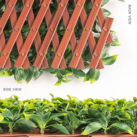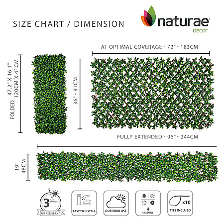 The Naturae Decor expandable trellis will be the perfect addition to add style and lifelike vegetation to your outdoor space. Made from high-quality materials and offering optimal privacy with UV-protected leaves, you can enjoy the product for years without having to replace it. A versatile solution to redesign and brighten up any space, whether it's a patio, a deck, or a balcony. The realistic luxurious artificial foliage requires no maintenance. Easy to install and made of sturdy but lightweight materials for outdoor use. Simply secure to a support and extend the trellis to the desired width and height. Standard size – optimal extension 36 in x 72 in, and maximum extension 18 in x 90 in (16 in x 48 in when folded). The expandable trellis is a cost-effective way to bring privacy and beauty to your project regardless of its size.