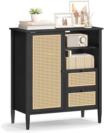 Model: VASAGLE Boho Buffet Cabinet, Synthetic Rattan Sideboard with Drawers, Storage Cabinet with Adjustable Shelves, Ink Black UBBK242B01