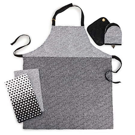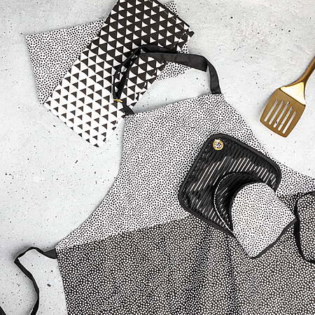 5 piece set includes apron, oven mitt, pot holder and 2 towels. Bold black tie dye print adds playful style to your kitchen. Perfect blend of function and fashion for everyday cooking. Apron and towels are machine washable in cold water. Oven mitt and pot holder are hand wash only. Heat resistant up to 392 degrees for safe handling.