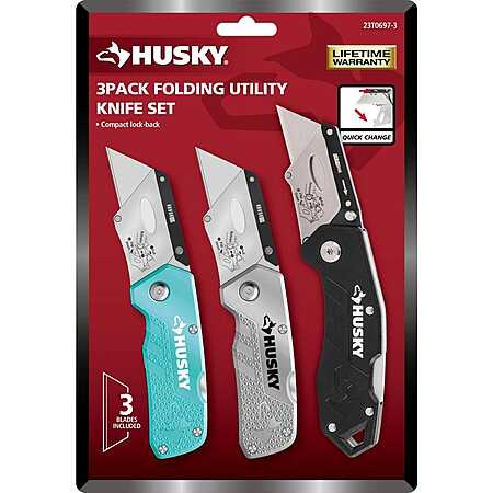 The Husky Folding Lock-Back Utility Knife (3-Pack) includes 3 knives and 3 utility blades. This knife features a quick-change blade mechanism that locks a standard utility blade in place for safety and efficient cutting. The handle is made of lightweight, durable aluminum for strength and features a convenient folding design. These knives are great for use at home, on the job or outdoors.