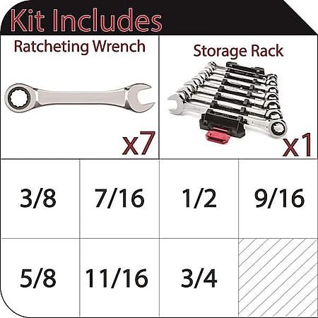- 7-piece set includes SAE sizes 3/8 in., 7/16 in., 1/2 in., 9/16 in., 5/8 in., 11/16 in., and 3/4 in.