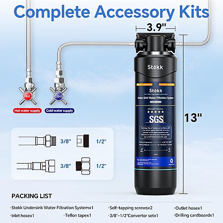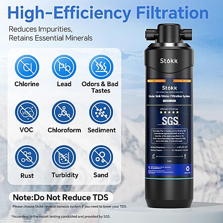 - ENHANCED UNDER SINK WATER FILTER - Stokk 0.5μm filtration system effectively reduces various impurities, including PFAS, PFOA, PFOS, fluorides, chlorides, sand, particulates and more, while retaining all essential minerals