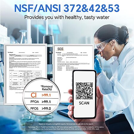 - TESTED AND CERTIFIED BY SGS - Made from high-quality, BPA-free and lead-free materials. Against from NSF/ANSI 53& 42 American National Standard, tested and certified by SGS to effectively eliminate the hidden risks of tap water. The Cartridage filter is Tested and Certified by NSF International against NSF/ANSI 42 & 372. Scan the QR for SGS online test report