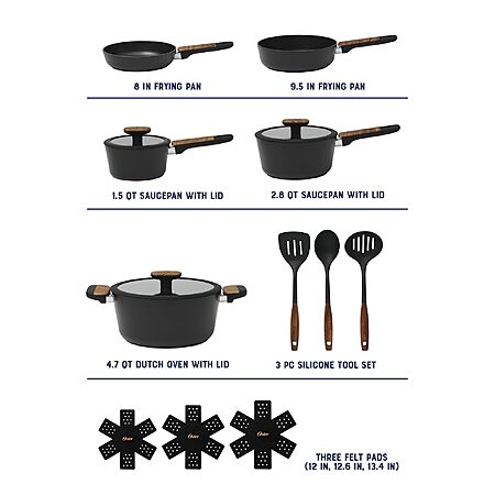 Per product page: Includes two frying pans (8 inches and 9.5 inches), two saucepans with lids (1.5 quarts and 2.8 quarts) and 4.7-quart Dutch oven with lid, three protective felt pads (12 inches, 12.6 inches and 13.4 inches), one silicone skimmer, one silicone slotted turner and one silicone spoon from the Oster Platinum Collection.