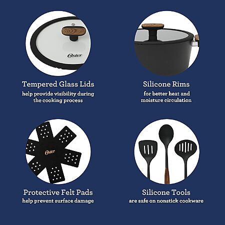 14-Piece Oster Platinum Oxburg Forged Aluminum Cookware Set w/ Ceramic Non-Stick Interior & Kitchen Tool Set (Black w/ Wood Handles) for