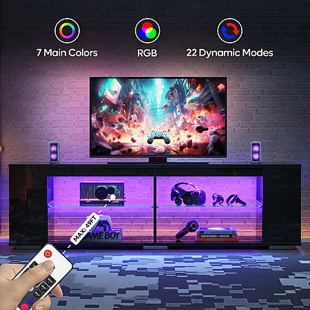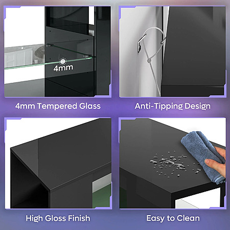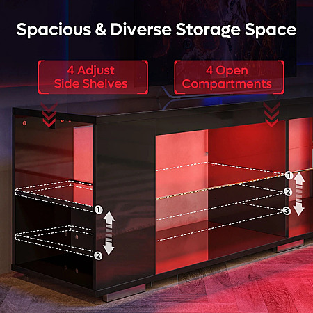 | Product Description: | Pinmoco 70'' TV Stand for TVs up to 80'', Gaming Entertainment Center with LED Lights, Modern Gaming Consoles for PS5 can perfectly match any style of room decor. The TV console made of CARB-certified P2 particleboard and 4mm tempered glass features distinctive adjustable transparent glass shelves that beautifully reflect various RGB lights, creating a dynamic and unique ambiance. Whether it's your living room, bedroom, or gaming room, this gaming entertainment center TV stand adds a touch of sophistication & gaming atmosphere, and 4 open compartments and 4 adjust side shelves for the PS5 offering ample storage to keep your space stylishly organized. The media console gaming TV stands is not just a piece of furniture, but a statement of style and convenience,making it an essential addition to your home. Pinmoco 70'' TV Stand for TVs up to 80'', Gaming Entertainment Center with LED Lights, Modern Gaming Consoles for PS5, Black Modern & High Glossy Design: With high-gloss finish design and elegant look, Pinmoco modern entertainment center for TV can perfectly match any style of room decor. Whether it's your living room, bedroom, or office, this TV stand adds a touch of sophistication. Remote Control for LED Light: This gaming television stands with 7 color and 22 modes LED light, you can change colors by remote control, besides, the distinctive transparent glass shelves that beautifully reflect various RGB lights, let you have an excellent & immersive viewing for video game experience. Multiple Storage Spaces: This TV table offers ample storage space to keep your living area tidy and organized. It features 4 open shelving areas separated by the tempered glass and 4 side shelves separated by the wood board for easy storage to your media devices, DVDs or gamepad, keep your entertainment center clutter-free. Customized Space and Adjustable Shelves: The Pinmoco TV cabinet is equipped with 2 adjustable glass shelves on front, and can be adjusted to three different heights. Large storage space on both sides with wooden shelves that can be adjusted in two heights.Multi compartment design can neatly accommodate media equipment, game consoles, etc. Sturdy & Stable Construction: The size of TV cabinet is 70.87 "L x 15.67" W x 20.45 "H. Crafted from P2 particle board and tempered glass, ensure stability and durability. The top frame of TV console load capacity up to 100lb, providing stable support for your TV and gaming equipment. Easy Assembly and Excellent Service: The 70-inch TV console equipped with necessary hardware, tools, and clear installation instructions, you can easily install. Pinmoco takes full responsibility for any quality issues, and we always stand by and provide satisfactory service. |