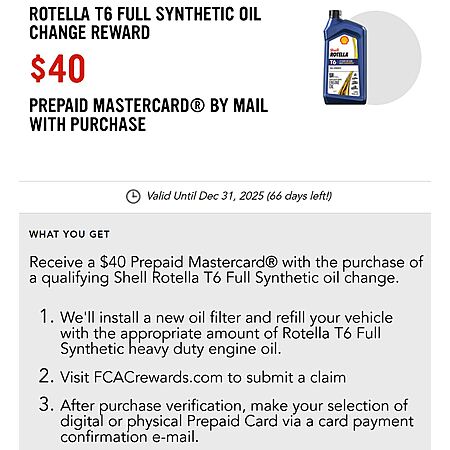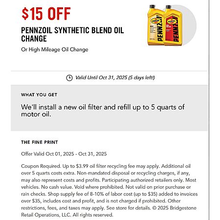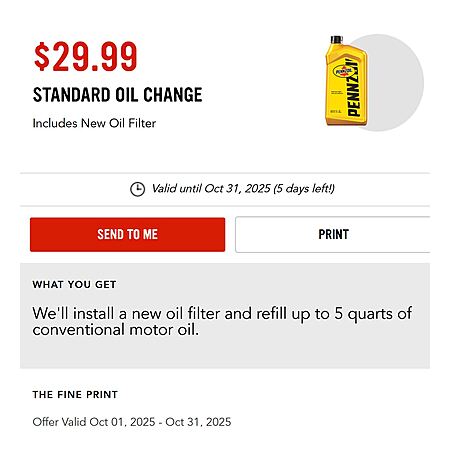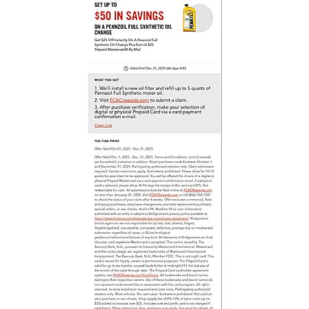 $25 Off Instantly on a Pennzoil Full Synthetic Oil Change, plus earn a $25 Prepaid Mastercard® by mail