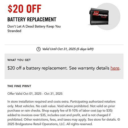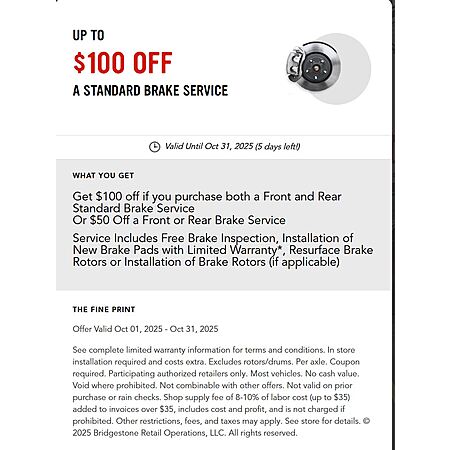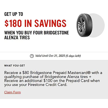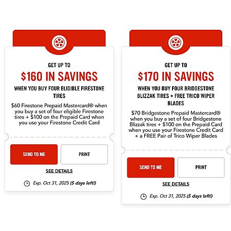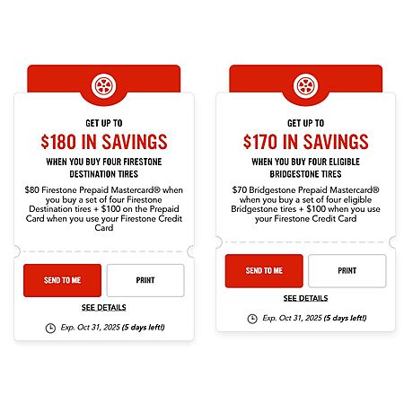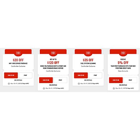 FIRESTONE has multiple offers for oil change, tire replacements, battery replacement, air filters, brakes, and alignment services