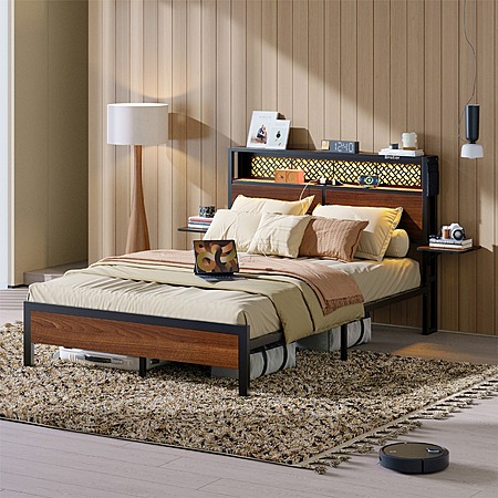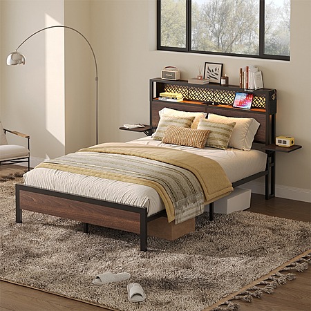 Bestier Full Size Platform Bed Frame w/ Foldable Bedside Shelves Charging Station & Storage Headboard (Walnut) $95 + Free Shipping