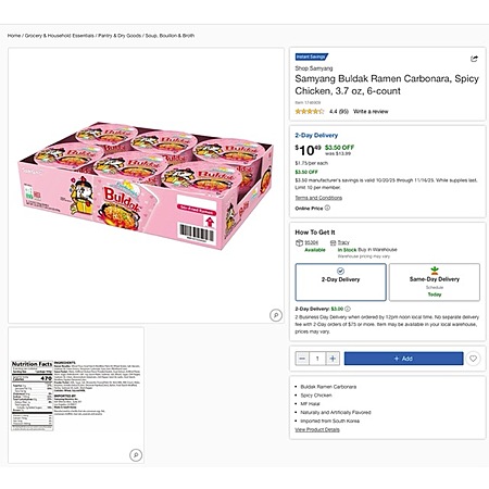 Samyang Buldak Ramen Carbonara, Spicy Chicken, 3.7 oz, 6-count $10.49