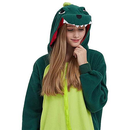Look cute in your Plush Dinosaur One-piece Pajamas! Crafted from ultra-soft polyester, the comfortable-fit fabric allows you to move flexibly while maintaining style and comfort. This cozy bodysuit will be a hit at any get-together, cosplay event, or pajama sleepover. Intricate detailing on the head and body bring this adorable character to life, with a precious tail to complete the look. Two front pockets are included and are convenient for storing your phone, wallet or other must-haves. The loose fit is comfortable and won't restrict your movements, giving you the freedom to sleep, dance or play as you please. For best results hand wash, lay flat to dry, and iron on low heat if needed. - Each pajama set is cut to fit close to the body for a sleek silhouette that lets you move around with ease. Perfect for everything from lounging around at home to bar crawls and music festivals! At the same time, such a loose-fitting material allows you to exercise flexibly while maintaining style and comfort. - From lovingly stitched face details on the hood, to tails and beyond, these fun costumes feature the perfect amount of detail to let you fully embrace the beast within. Pair your dinosaur one-piece, you'll be the star of your next sleepover! - A perfect blend of comfort and fun, the high-quality plush construction is soft and cozy, to keep you warm during chilly winter evenings. Each pajama is designed with a hood, featuring eyes, nose, and mouth for full effect, matching tail designs help complete your cosplay look. - We recommend your new onesie costume be hand washed and laid flat to dry before wearing. Available in adult sizes Small through Large. If ironing is required, it is recommended that it be done only on low heat. See the size chart for details.