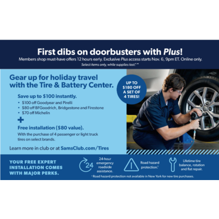 Sam's Club Members: Purchase 4 tires (Goodyear, Pirelli, Michelin, goodrich, bridgestone) and get free installation