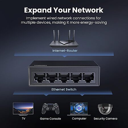 UGREEN GROUP LIMITED via Amazon has 5-Port UGREEN 1000Mbps Gigabit Ethernet Switch on sale for $7.98. Shipping is free w/ Prime or on $35+ orders.